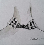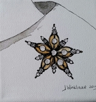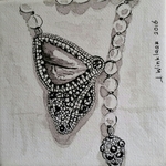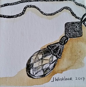 Een serie sieraden van 10x10 op doek, Oost-Indisch inkt en koffie.